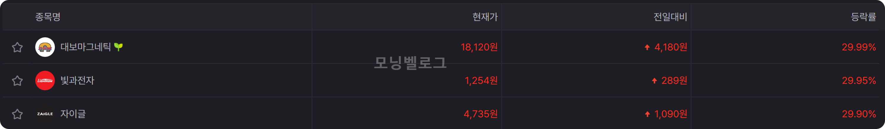 오늘 상한가에 가까운 급등세를 보인 세 종목은 각기 다른 배경을 가지고 있습니다. 데보마그네틱은 2차전지 섹터의 견조한 흐름을, 자이글은 신사업 전환에 대한 기대감을 반영하는 반면, 빛과전자는 뚜렷한 개별 호재 없이 수급에 의한 움직임으로 보입니다.